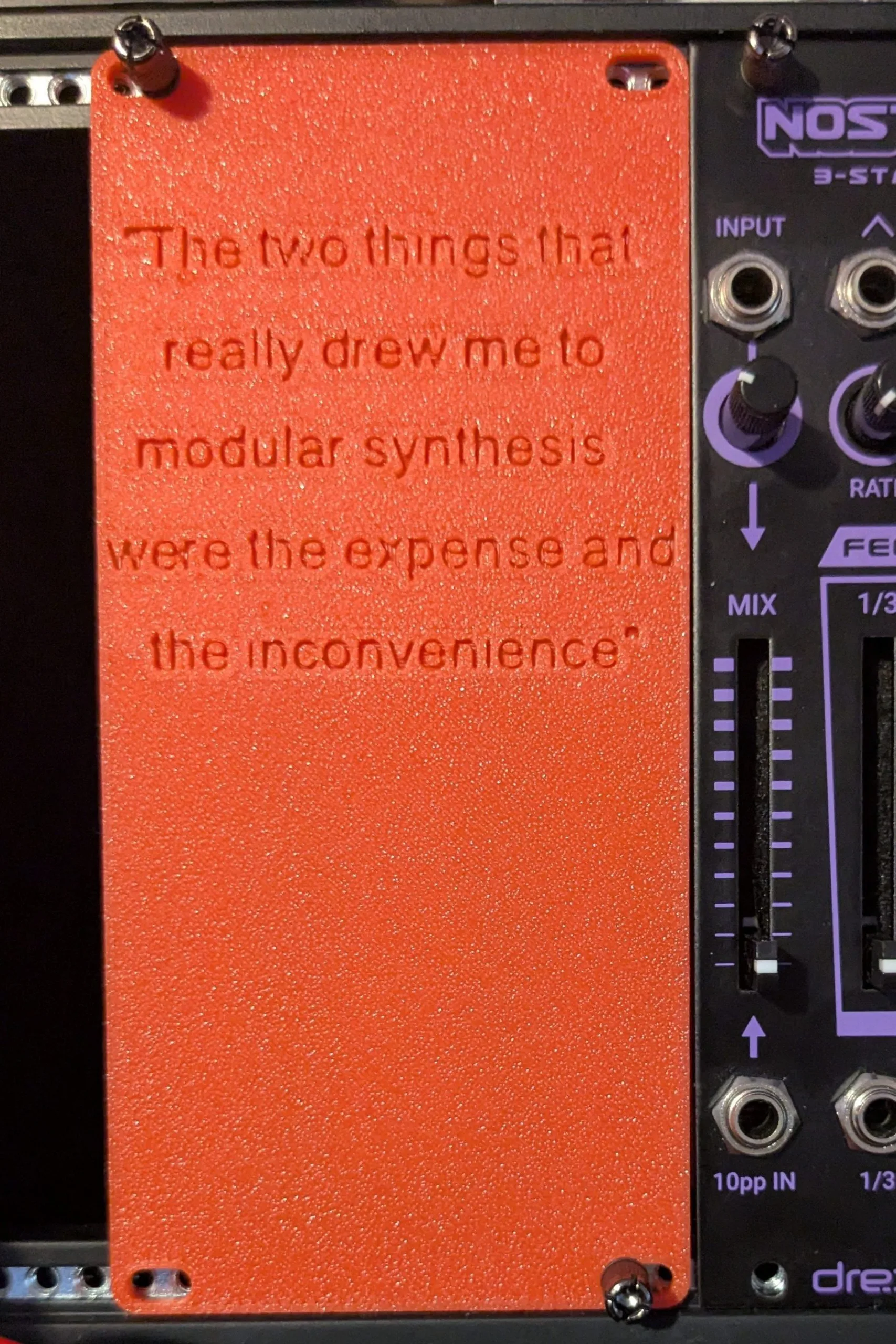 Its not just synth stands that you can 3D print, how about some customized blanking plates for your modular setup? (or even the panels for you own modules!) I took a standard blank panel template from Makerworld.com and added some text to customize it, that I saw in a cartoon.